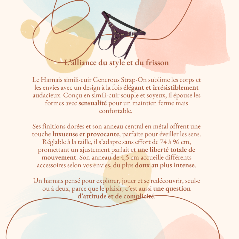 Ce harnais s’adresse à tous ceux et celles qui souhaitent enrichir leur vie intime avec une touche d’élégance et d’audace. Que ce soit pour expérimenter, renforcer la complicité ou simplement s’amuser, le harnais Generous offre une approche raffinée du plaisir.