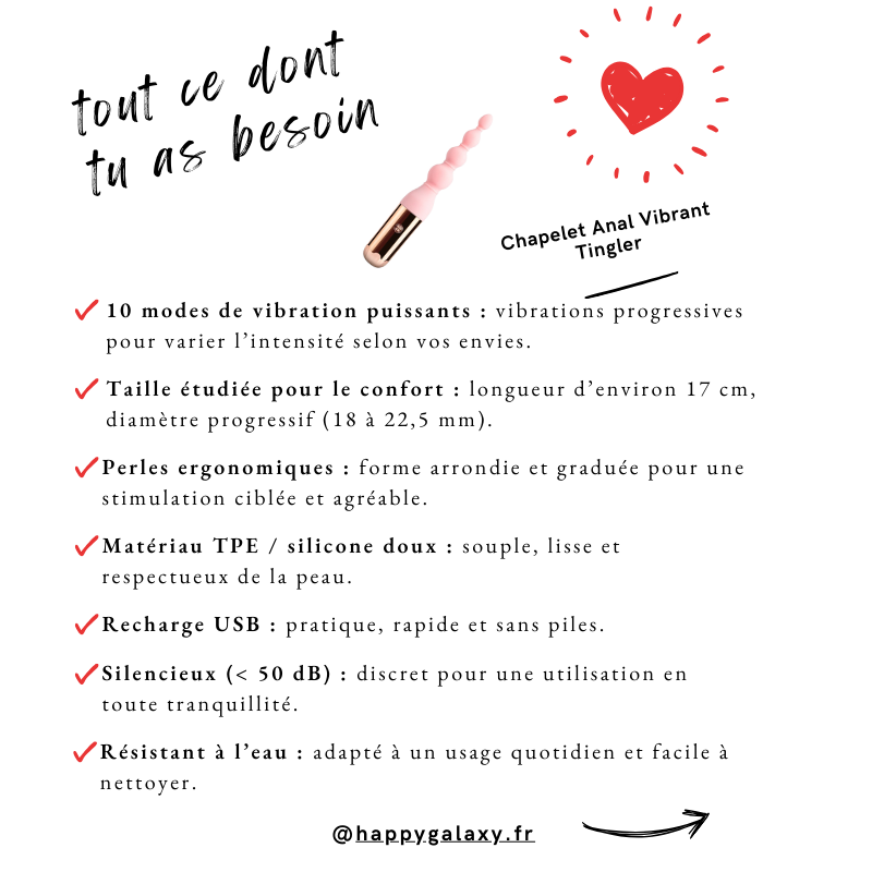 Grâce à ses multiples modes de vibration, le Chapelet Anal sait s’adapter à toutes les humeurs. Tantôt délicates et enveloppantes, tantôt plus rythmées et audacieuses, les vibrations stimulent avec précision et relancent l’excitation au moment parfait. On alterne, on teste, on se surprend soi-même. Ce jeu constant entre douceur et intensité transforme chaque utilisation en une expérience personnalisée, où le plaisir se fait attendre… puis désirer encore plus.