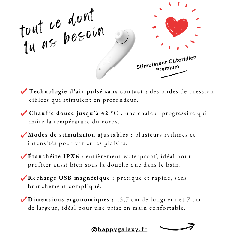 Autre détail qui fait toute la différence : la fonction chauffante. Le Stimulateur Clitoridien Premium diffuse une chaleur douce pouvant atteindre 42 °C, proche de la température du corps. Cette sensation tiède crée immédiatement un climat de détente et de confiance, favorisant le lâcher‑prise. La chaleur amplifie les sensations et rend chaque pulsation plus réaliste, plus troublante, presque vivante.